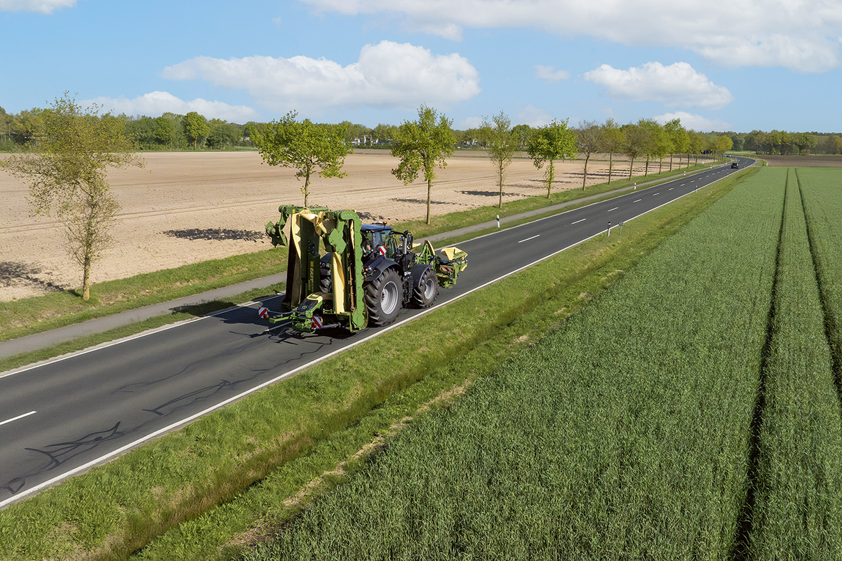 Avec le EasyCut B 1250 Fold, KRONE présente un nouveau groupe de fauche, idéal pour une utilisation en CTF (Controlled Traffic Farming). Les assiettes extérieures repliables sont une véritable nouveauté qui permet de transporter la machine aisément et en toute sécurité sur la route. Par ailleurs, le groupe de fauche se transporte sans problème sur la route grâce à une réelle innovation : le système de repliage des assiettes extérieures, unique sur le marché, breveté et baptisé Fold.