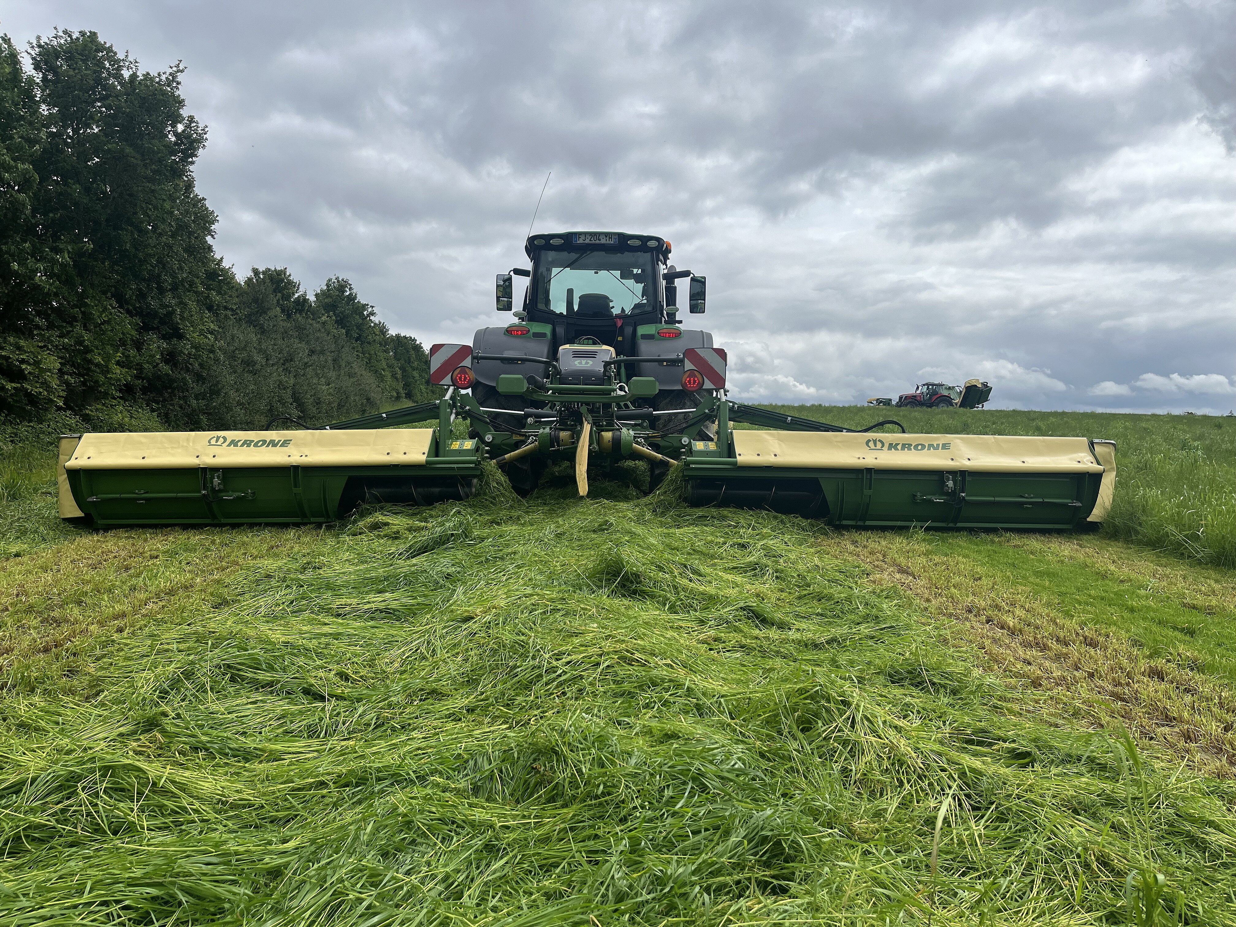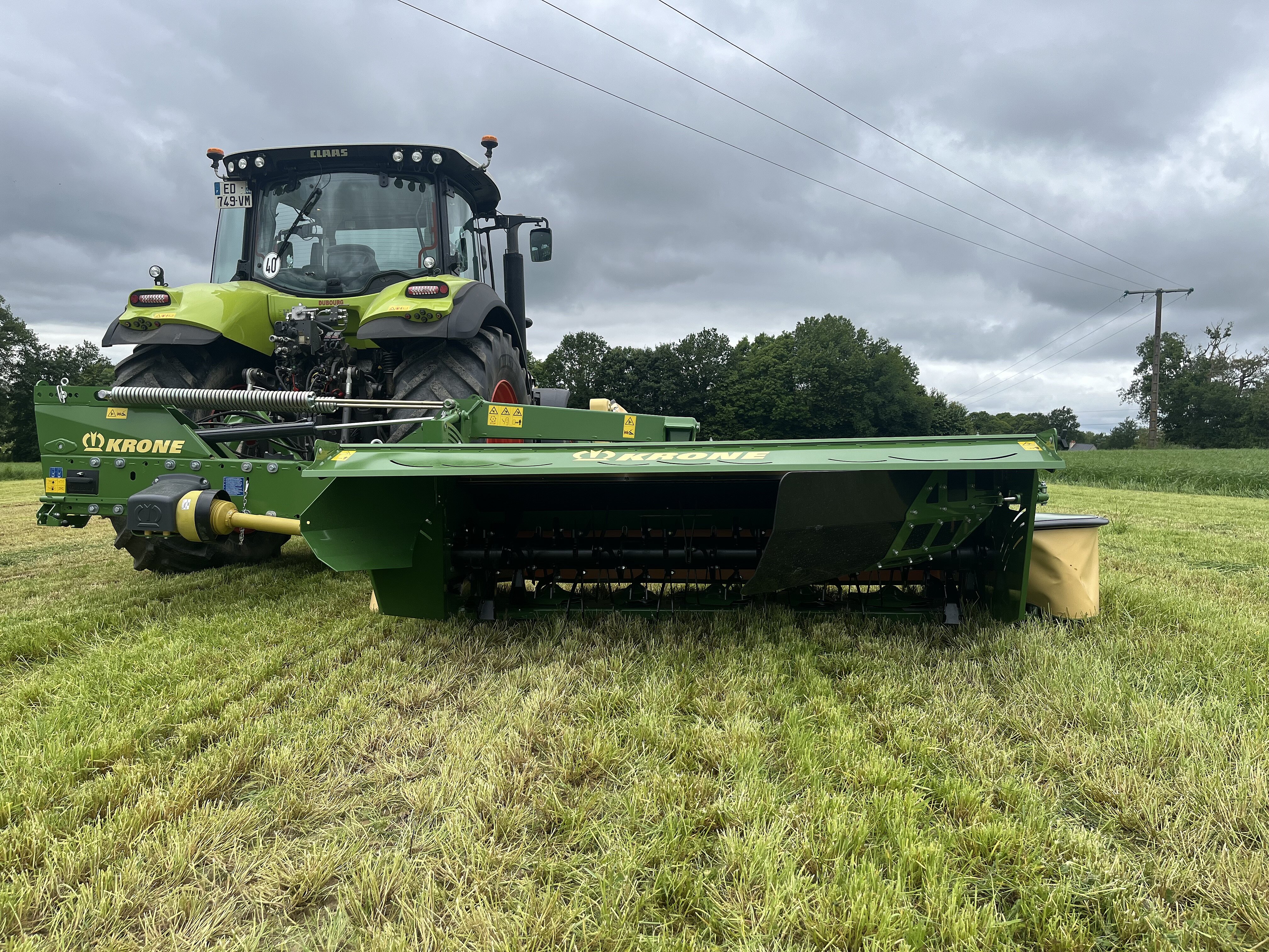 Les modèles EasyCut B 880 CV (Collect) sont la toute dernière génération de groupes de fauche avec conditionneur de la gamme KRONE. Présentés lors du salon AGRITECHNICA 2023, ils bénéficient des toutes dernières évolutions KRONE : lamier robuste EasyCut, nouvelle suspension oléopneumatique pour plus de confort et de respect de la couche herbacée, toiles tendues pour faciliter le lavage, conditionneur à fléaux CV ou à rouleaux polyuréthane CR ou acier MRolls, boîtier PreSelect DS 50 ou PreSelect Digital ou encore commande ISOBUS Confort. La dépose en andains n’est pas en reste grâce au système Collect : deux tapis à entraînement et abaissement hydraulique viennent récupérer le fourrage au niveau du conditionneur afin de la déposer au centre ou sur le côté selon les besoins de l’utilisateur, ou même directement à plat au sol si les tapis sont relevés. Jusqu’ici, il était possible de faire varier la largeur d’andains en faisant varier la vitesse des tapis depuis la cabine, ou encore via deux rouleaux accélérateurs d’andains à entraînement hydraulique. Avec une largeur de travail de 8m72 au plus large, ce modèle se situe dans le cœur de gamme du marché français des groupes de fauche avec conditionneur.