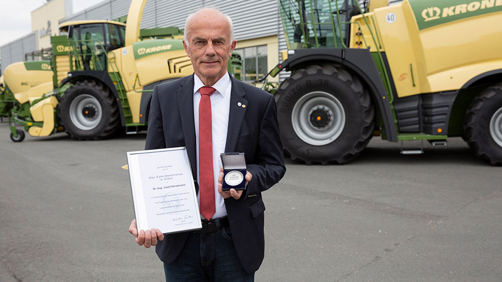 Spelle/Ibbenbüren, juin 2022 – Le Dr et ingénieur Josef Horstmann, responsable du département R&D et gérant associé de la Maschinenfabrik KRONE pendant de nombreuses années vient de recevoir la médaille commémorative d’argent Max-Eyth. Hubertus Paetow, président de la Deutsche Landwirtschafts Gesellschaft e.V. (DLG - Société Allemande d‘Agriculture), lui a remis cette distinction particulière dans le cadre d’un congrès commun de la DLG et de l’Union des ingénieurs allemands (VDI). Comme l’a souligné monsieur Paetow dans son discours, le Dr Horstmann a reçu cette médaille commémorative pour ses capacités et ses performances de développement novatrices, ainsi que pour son engagement exceptionnel dans le domaine du machinisme agricole. En effet, le Dr Horstmann a joué un rôle majeur dans le domaine des échanges de données entre tous les constructeurs et toutes les machines du monde agricole, afin que les agriculteurs et les entrepreneurs puissent faire face aux défis liés au Farming 4.0, de la meilleure façon possible et ce dans le monde entier.