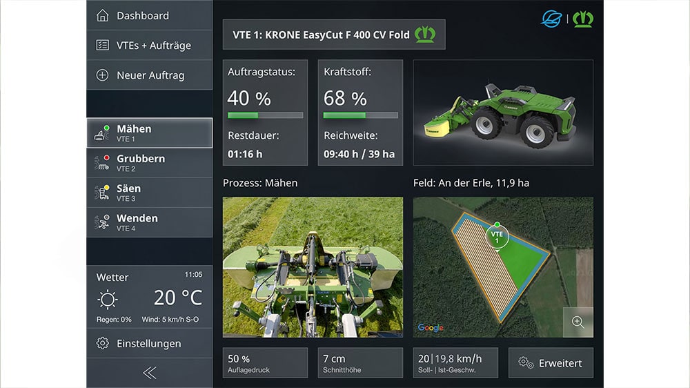 La conception de l’unité d’entraînement, Lemken et KRONE a été adaptée en fonction de la puissance demandée pour les travaux agricoles mentionnés ci-dessus. Le concept est ainsi doté d’un entraînement diesel-électrique d’une puissance totale de 170 kW (230 chevaux). La puissance est transmise électriquement sur les deux essieux et sur la prise de force. L’attelage des outils portés à l’unité d’entraînement est assuré par une interface trois points. Le véhicule tracteur est doté de systèmes complets de capteurs qui surveillent l’environnement et les outils de travail ; la sécurité du chantier et un résultat de travail optimal sont au rendez-vous. Le pilotage et la surveillance de l’unité par l’utilisateur sont réalisés par des terminaux mobiles ; les comptes-rendus de chantiers et les documents associés sont transmis par le biais d’un module de communication et de la plateforme de données partagée bien connue Agrirouter.
