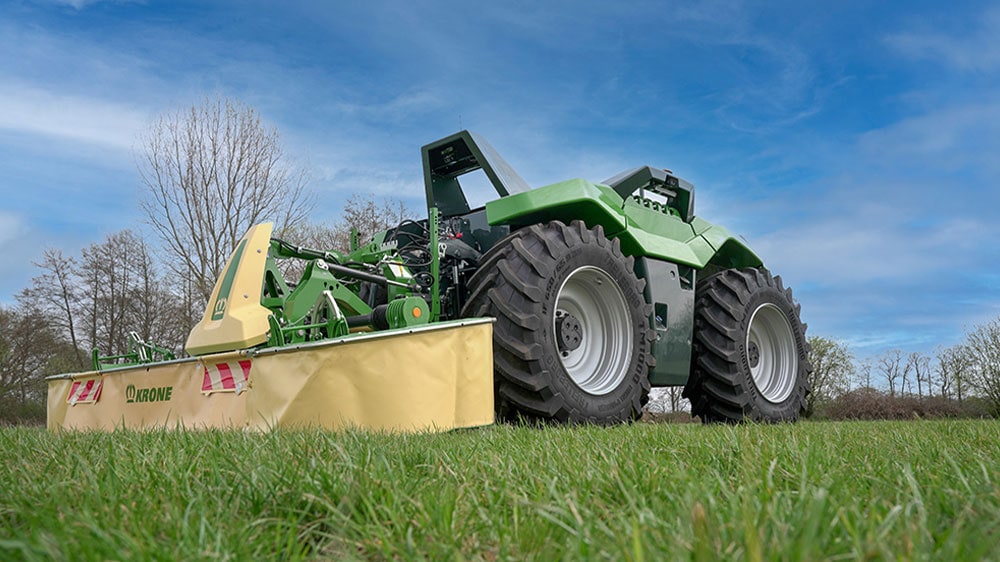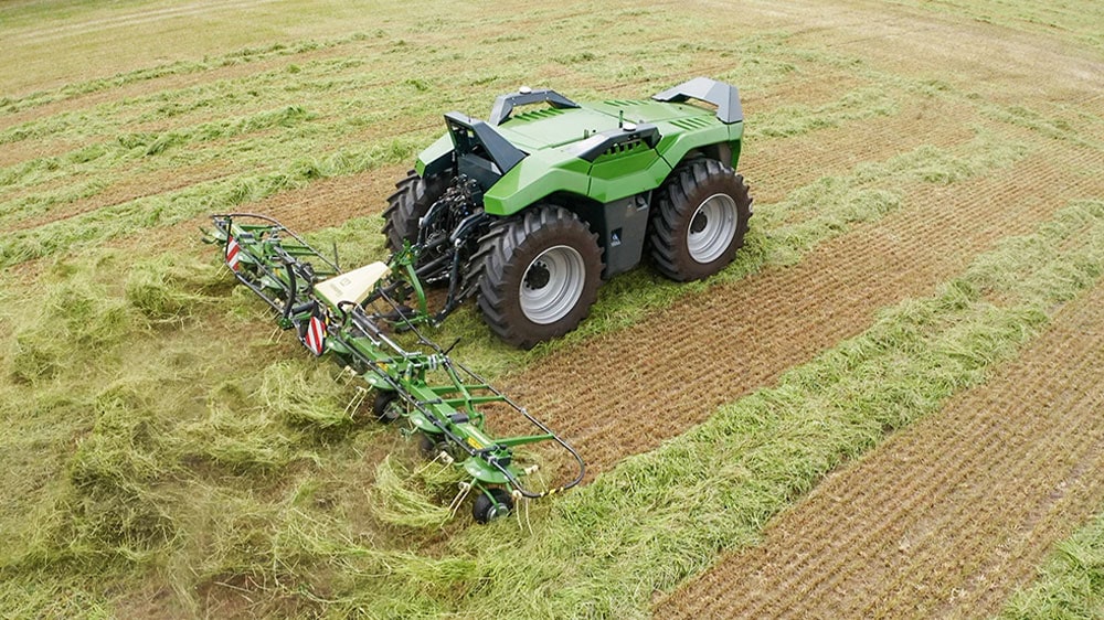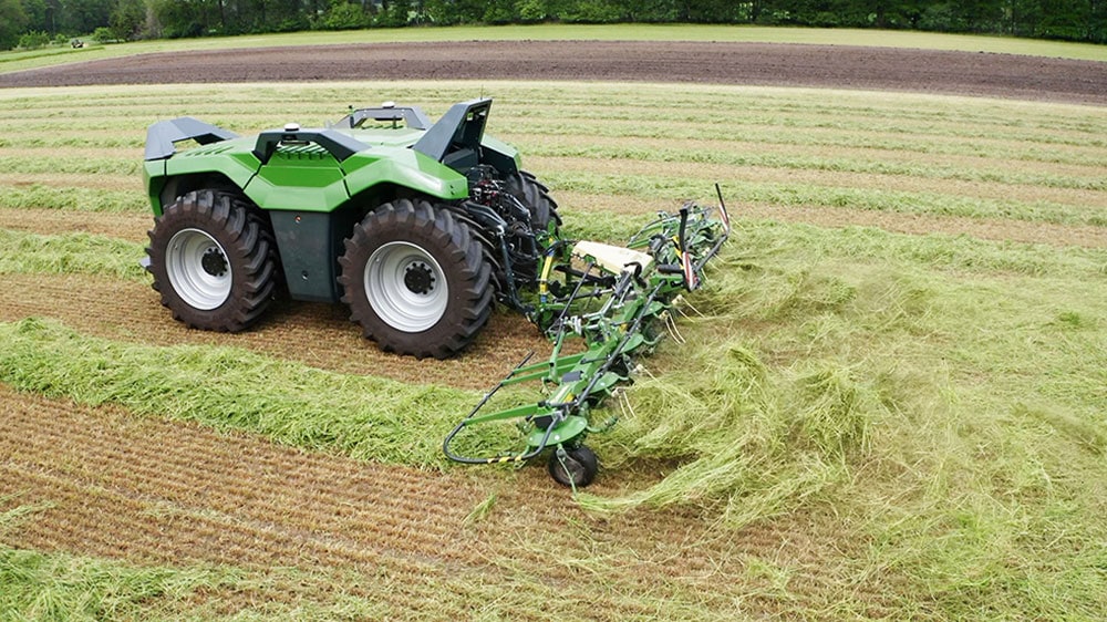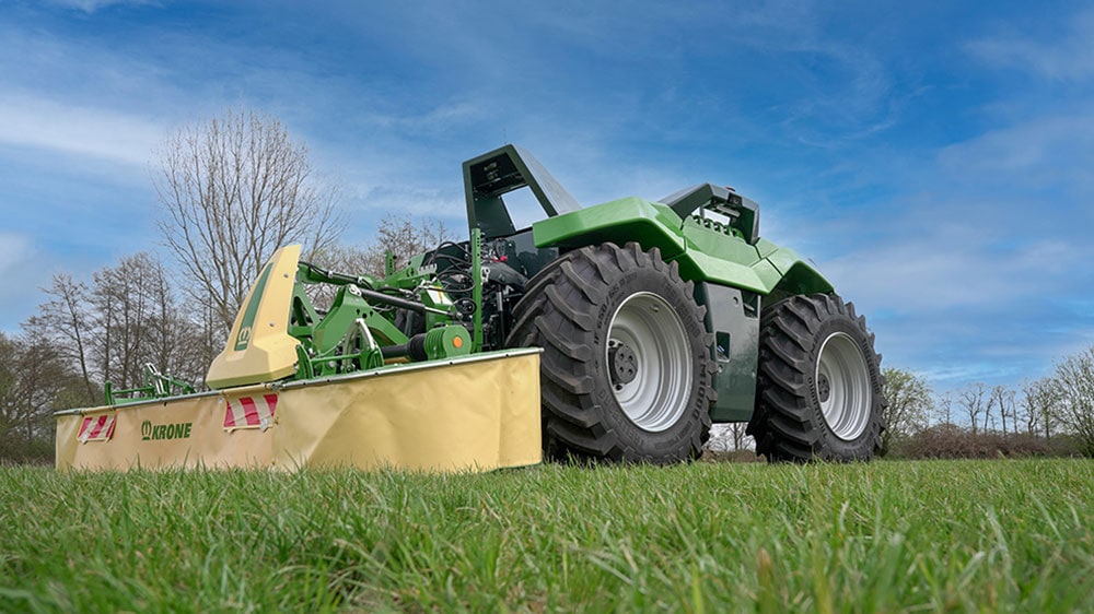 Sur une parcelle localisée à Hopsten (Münsterland, Allemagne), deux VAA ont été présentés en action. Un VAA a travaillé avec une faucheuse frontale KRONE EasyCut F 400 CV Fold d’une largeur de travail de 4 m. Après le fauchage, une faneuse Vendro 820 a été rapidement et facilement attelée au véhicule. Le VAA s’est révélé très à l’aise au travail de fanage sur les 8,20 m de largeur de travail de la Vendro. Sur une parcelle parallèle, un autre VAA a travaillé avec des outils de travail du sol Lemken. En action, un semoir monograine 8 rangs de la gamme Azurit 10 K 8 et un cultivateur modifié Karat 10 en largeur de travail de 3 m ont également évolué aisément.