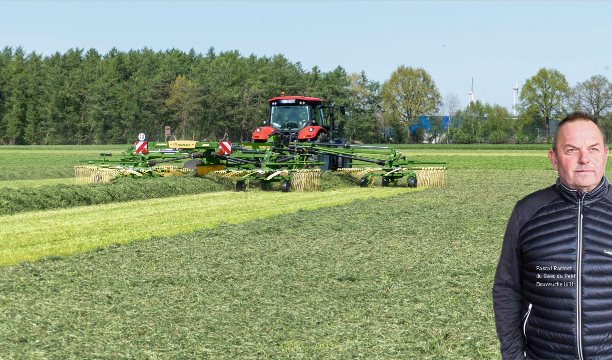 Valentin Fillieul et Pascal Racinet, les deux associés du Gaec du Petit Bouveuche dans l’Orne, exploitent 250 ha de prés de vallée. « Nous sommes dans une région qui, historiquement, produisait peu de lait sur de grandes surfaces. Pendant la période des quotas laitiers, pour augmenter notre production laitière, nous avons dû reprendre beaucoup de terres » explique Pascal Racinet. Il s’est donc lancé dans le commerce de foin pour valoriser leurs nombreux hectares de prairies naturelles. Avec les deuxièmes coupes, les regains et les 40 ha d’ensilage de dérobées destinés à leur troupeau de 120 vaches laitières, ce sont plus de 500 ha d’herbe qui sont fauchés et andainés chaque année. La récolte du foin se fait en 4 jours. Le premier jour, l’herbe est fauchée et fanée dans la foulée. Le deuxième ainsi que le troisième jour, elle est fanée. Le quatrième jour, elle est encore fanée puis andainée et pressée en balles carrées. Les ballots de foin sont ramassés et stockés sous abri le jour même. « Le jour du pressage, nous sommes au minimum 4 sur le chantier » précise Pascal Racinet. Les deux associés se sont équipés d’un combiné de fauche de 11 m, d’une faneuse de 16 m, d’un andaineur quatre rotors de 12,5 m et d’une presse à balles cubiques avec un pick-up de 2,35 m, tous de la marque KRONE. « Nous pouvons avoir jusqu’à 130 ha fauchés qui attendent d’être récoltés » commentent les deux éleveurs . Malgré son débit important , la presse était le facteur limitant dans la chaîne de récolte car elle ne pouvait pas être exploitée à pleine capacité. « Comme nous courrons toujours après le temps, il faut maximiser son débit pour botteler au moins 50 ha par jour » explique Pascal Racinet. Pour augmenter les surfaces pressées par jour, il faut l’alimenter avec des andains volumineux et donc, travailler sur une grande largeur. Avant l’achat d’un andaineur quadri-rotors, les exploitants utilisaient un bi-rotors à dépose centrale de 10 m de large. A l’usage, ils ont expérimenté que « la largeur de travail effective ne dépassait pas 8,5 m car, quand la machine était déployée à son maximum, l’andain formé était trop large pour le pick-up de la presse ». Ils l’ont remplacé par un andaineur KRONE Swadro TC 1250, une machine à 4 rotors de 12,5 m de large. « Je peux vraiment travailler sur toute sa largeur car l’andain ne dépasse pas 2,2 m » constate Pascal Racinet après quelques mois d’utilisation. Une autre solution aurait été de s’équiper d’un bi-rotors à dépose latérale pour regrouper plusieurs andains. Pour Pascal Racinet, « la dépose centrale a l’avantage de former un andain plus régulier, plus tassé, moins torsadé et donc plus facile à ramasser avec le pick-up de la presse ». Le Swadro TC 1250, sans commande isobus, est le modèle d’entrée dans la technologie 4 rotors chez KRONE pour un prix catalogue de 80 000€ TTC (autour de 65000€ HT - 5200€ HT / m). La largeur de travail est comprise entre 9,8 m et 12,5 m pour une largeur d’andain de 1,4 m à 2,2 m. Les deux exploitants ont choisi la marque KRONE « pour la robustesse des machines et pour la qualité de ramassage » qu’ils jugent au nombre de bras sur chacun des rotors. Le TC 1250 est équipé, à l’avant, de rotors de 3,3 m de diamètre dotés de treize bras et de rotors de 2,96 m à quinze bras à l’arrière. Les rotors avant tournent 1,25 fois plus vite que ceux à l’arrière pour projeter l’herbe (et non la déposer en andain) vers les rotors arrière, ce qui contribue, selon le constructeur, à la qualité de l’andain. Les rotors tournent à sec grâce à des boîtiers à roulements à billes hermétiques qui ne nécessitent aucun graissage. Chaque bras est équipé de quatre doubles dents avec un profil courbé vers l’avant. Cela leur permet de soulever le fourrage qui pèse moins sur le bas des dents ; celles-ci reculent donc moins vers l’arrière en travaillant. Selon le constructeur, ce dessin des dents permet de positionner les rotors 1 cm plus haut qu’avec des dents droites. « Nous qui avons des silex dans nos prairies, nous pensons que cela limitera l’usure des dents » anticipe Pascal Racinet. La hauteur au sol se règle indépendamment pour chaque rotor avec une manivelle et un contrôle visuel sur une échelle graduée. La suspension des rotors avant est hydraulique et celle des rotors arrière par ressorts. Les largeurs de travail et de l’andain se règlent en jouant sur les distributeurs hydrauliques du tracteur directement depuis la cabine. Pour Pascal Racinet, « le TC 1250 n’est pas très différent en termes de mécanique, d’utilisation et d’entretien de ce que je connaissais avec mon andaineur à double rotors ». Il prévient, cependant, « qu’il faut un tracteur lourd pour ne pas se laisser entrainer par la machine qui pèse quand même 5,2 tonnes. Il faut-être vigilant sur la route ».