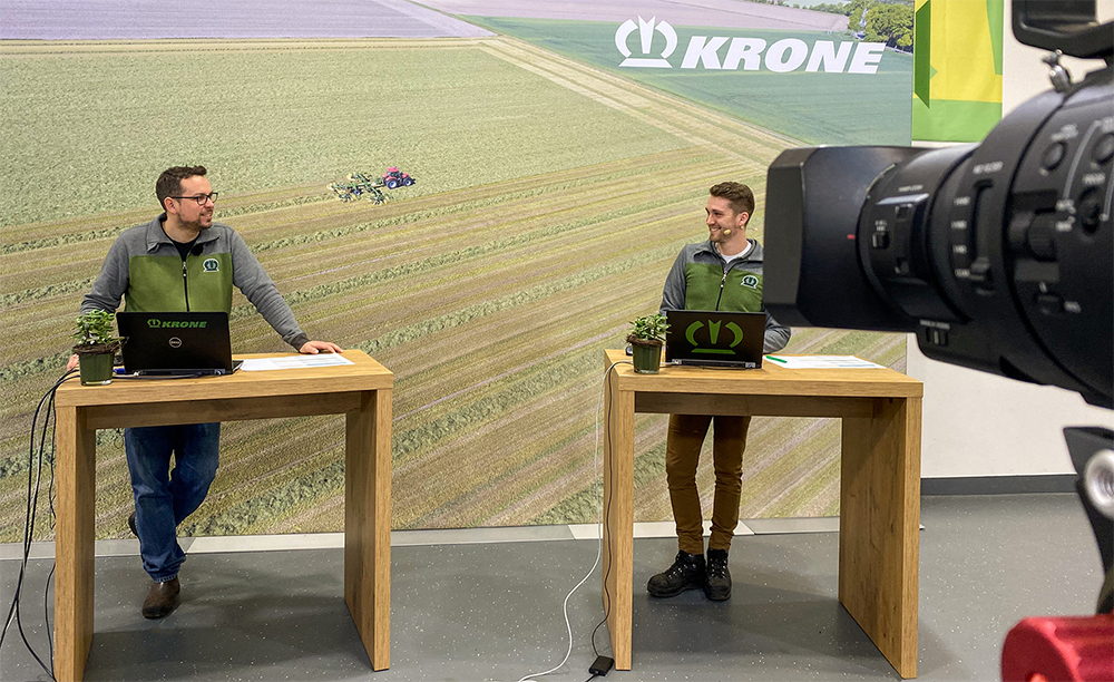 Wolfgang Jung, responsable KRONE pour Service & Parts, tire un bilan positif après un an de formation en ligne. « Grâce à l‘interaction professionnelle de plusieurs services, nous avons pu acheter et installer très rapidement l’équipement nécessaire pour nos nouveaux services de streaming. En parallèle, nous avons transformé un hall du centre de formation en un studio de tournage ! Ainsi nous avons été en mesure de présenter les nouvelles machines KRONE pour 2021, pour la première fois de façon entièrement digitale et en direct, par le biais d’un format appelé Distance-Training. Les retours positifs de nos partenaires nationaux et internationaux nous ont encouragé à développer cette voie de façon professionnelle. Ainsi la technique que nous utilisons nous permet même un suivi différé du livestream, c'est-à-dire que les participant(e)s peuvent se joindre plus tard - en fonction du fuseau horaire local - et revenir simplement au début du flux. Grâce à cette technique, nous pouvons saluer sur une seule et même session simultanément des participants de Nouvelle-Zélande et de la côte Ouest des USA, bien que le décalage horaire soit presque d’une journée. C’est pourquoi nos formateurs saluent les invités connectés par un amical 'Good morning, good afternoon and good evening, ladies and gentlemen. » !