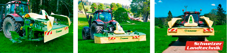 « La nouvelle faucheuse frontale Krone « EC F 400 CV Fold » fauche une largeur de 4 mètres. Elle est repliable à 3 mètres pour circuler sur la route. Sur la ferme des Amstutz elle est attelée au trois-points arrière d’un Valtra « N174D » à poste inversé. Frank Amstutz et son fils Marc gèrent une exploitation laitière de plus de 80 hectares de prairies et de pâturages à Mont-Tramelan, dans le Jura bernois. »
