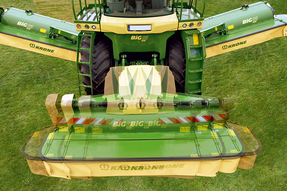 Le déport latéral hydraulique de la faucheuse frontale utilise, en plus du capteur d’angle de braquage placé sur l’essieu arrière, un capteur d’inclinaison monté sur le châssis principal. Ce capteur fournit en direct les données sur les conditions de travail, comme par exemple sur la pente ou les courbes. Le système calcule en plus de l'angle de braquage, l'inclinaison et la dérive de la machine qui permet de déporter automatiquement la faucheuse frontale, sans que le conducteur ait à intervenir sur la machine. De même, le capteur d’inclinaison contrôle la répartition de la force de traction sur les quatre roues, la traction de la BiG M est ainsi nettement améliorée et la couche herbacée est parfaitement préservée.