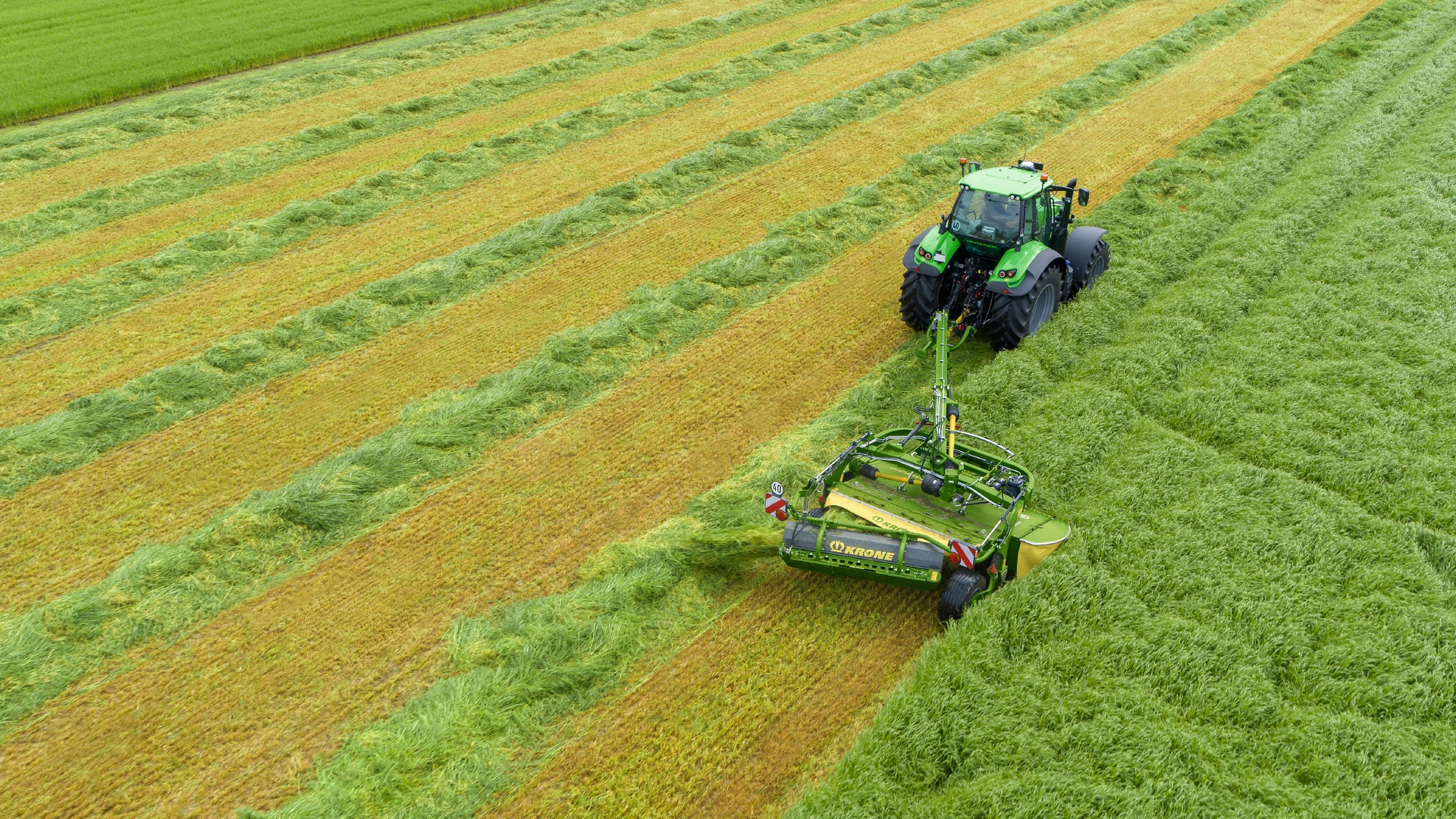 Les nouvelles faucheuses trainees KRONE avec timon lateral impressionnent par leur structure simple et compacte. La faucheuse est guidée à droite du tracteur. La forme courte du timon latéral favorise des rayons de braquage serrés et réduit la durée de tournière. Pour augmenter encore le rendement, elle peut aussi être combinée avec une faucheuse frontale.