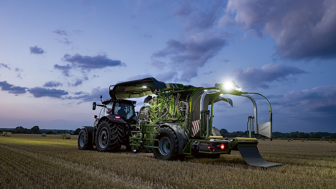 [Translate to FR:] Die serienmäßige Arbeitsbeleuchtung der CombiPack HDP sorgt für optimale Sicht und erhöht den Bedienkomfort bei jeder Tages- und Nachtzeit. Die Bereiche um Pick-up, Rotor, Folienvorrat und Wickeltisch werden gezielt ausgeleuchtet, sodass auch bei schwierigen Lichtverhältnissen präzise gearbeitet werden kann. Die LED-Wartungsbeleuchtung beleuchtet zusätzlich die Bindeeinheit, den Bereich unter den Seitenschützen sowie die Heckklappe für den Ballenauswurf. So werden Wartungsarbeiten und der Ballenhandlingprozess noch sicherer und komfortabler.