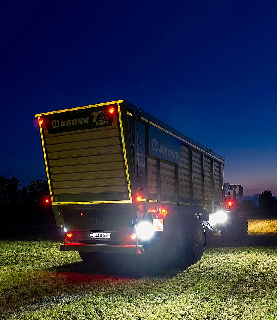 Les remorques polyvalentes TX KRONE sont équipées en standard de deux, en option de quatre, phares à LED latéraux supplémentaires. L'éclairage sur l'essieu et ses alentours facilite les manœuvres et le déplacement parallèle de nuit et augmente la sécurité sur le silo couloir.